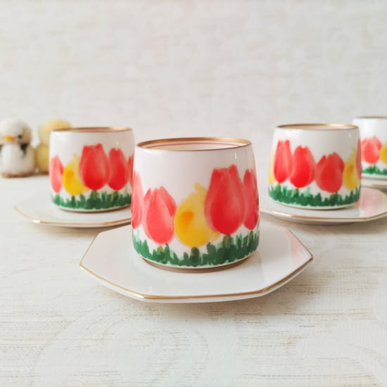 佐賀県、有田焼の老舗窯元、香蘭社の湯呑み&茶托(カップ&ソーサー)。 手描きの水彩画のようなふんわりとしたチューリップ柄がかわいく、サイズは小ぶり。 ハンドルがないため、湯呑みやスープ、フルーツ、デザートにも、アイデア次第でいろいろな使い道がありそうです。 こちらは1990年頃に販売されていました。目立たない程度ですが小さなキズ、金彩のわずかなカスレがありました。ヴィンテージ品としては、全体的にコンディション良好です。 撮影時の光の加減により、実物のチューリップ柄はもう少し薄い朱色になります。 サイズ カップ:口径5.7cm 高さ6cm ソーサー:直径11cm 高さ1cm ※1客のお値段になります。 ※数量はカートに入れた後に変更できます。 ※金彩は金属質の絵付けのため、電子レンジに入れると火花が散ったり、破損の原因となる可能性がございます。電子レンジのご使用はお控えください。