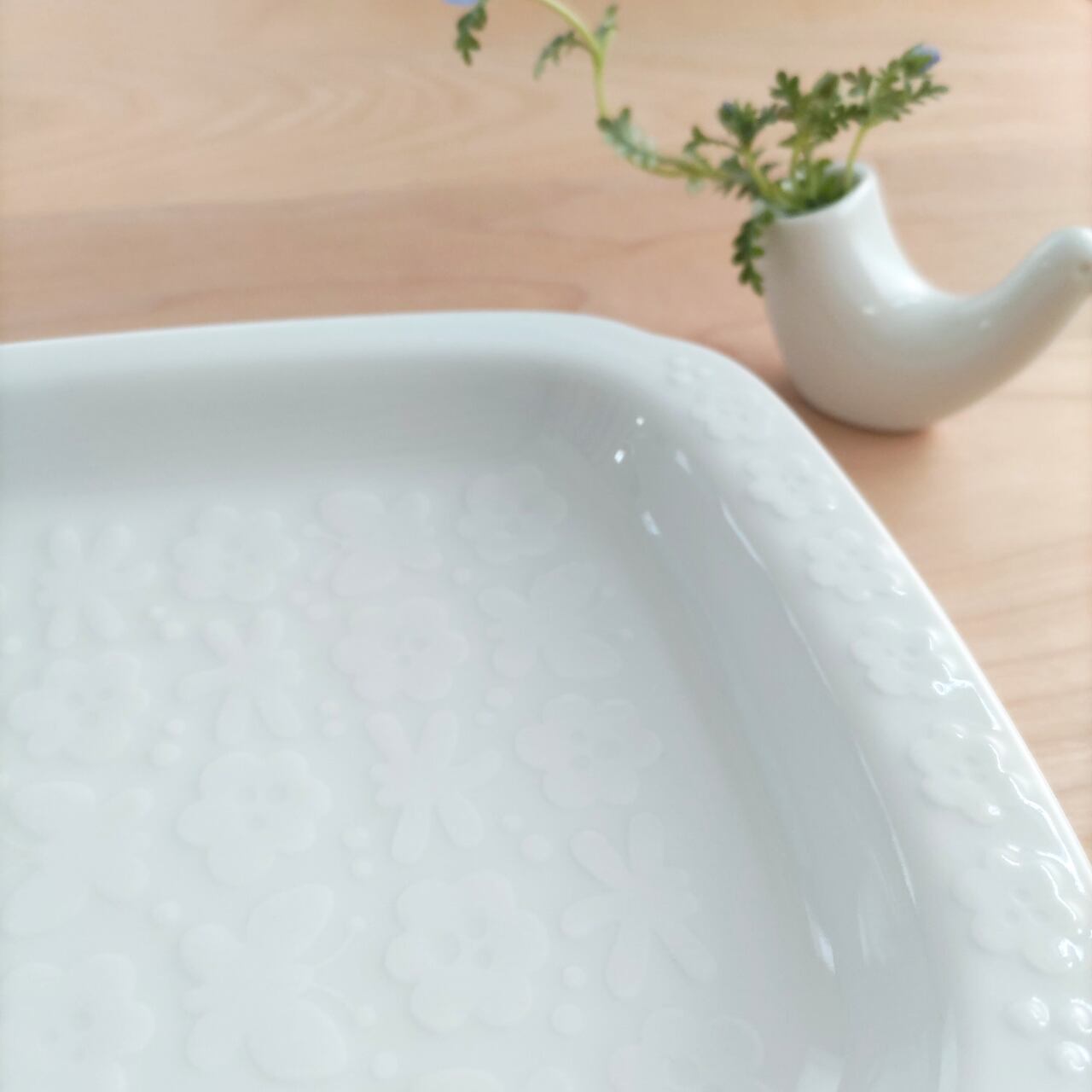 釉薬を通して表現される立体的な花と蝶の彫りは、光の当たり具合によって美しい陰影が生まれ、その表情は豊かに変化します。絵付けとは異なり、磁器本来の素材感が際立つ、可愛いながらも上品で洗練された仕上がりも特徴です。
