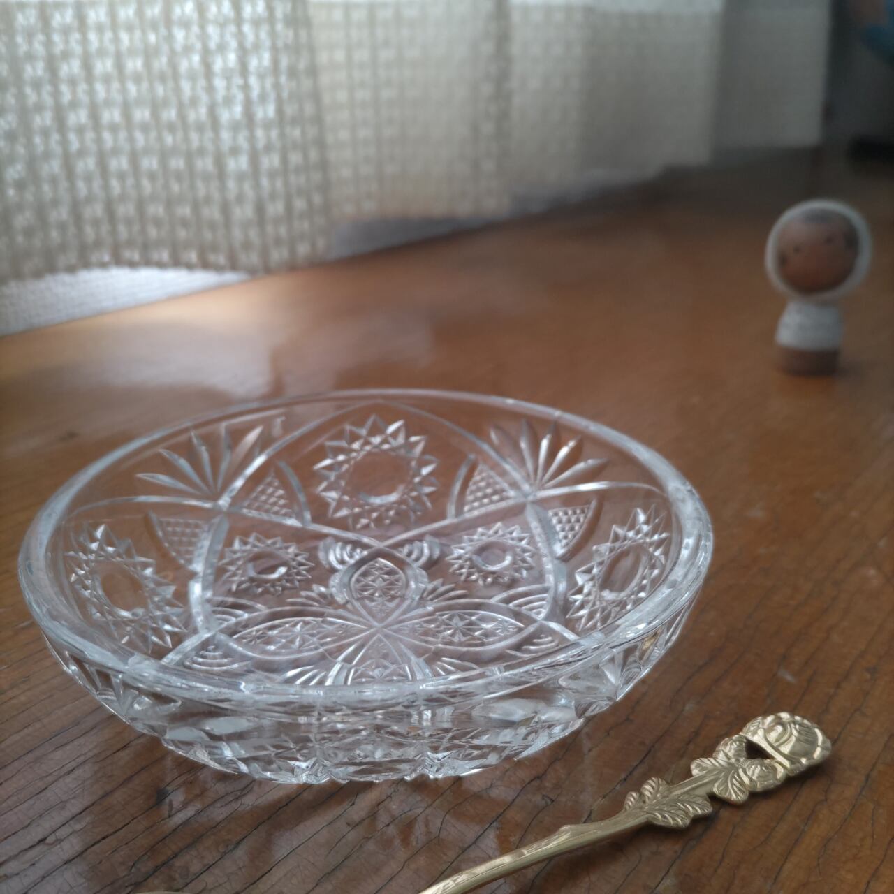 素材は、どこか懐かしく温かみを感じさせるプレスガラス。プレスガラスとは、溶かしたガラスを型に流し込み、プレスして作る技法。日本では大正から昭和初期に多くつくられ、現代では「レトロガラス」や「和ガラス」として注目されています。