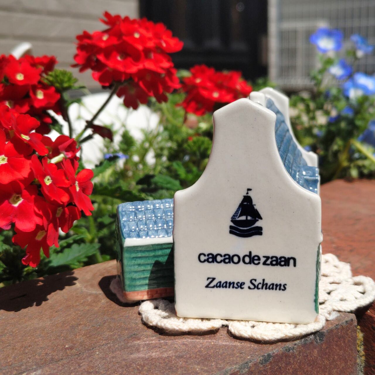 側面にある「cacao de zaan」はオランダのココア製造会社のブランド名、「Zaanse Schans」は、アムステルダム近郊にある、伝統的な風車や木造家屋が立ち並ぶ美しい村で、野外博物館としても有名です。このオブジェはザーンセ・シャンス(スカンス)にある建物をモチーフにしたものです。
