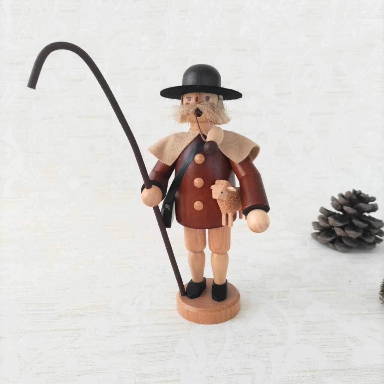 人形の下部にコーン型のお香を置いて火を灯すと、羊飼いの口元からゆらゆらと煙が立ち上る仕組みになっていて、素朴な木の質感が、ドイツ・エルツ地方の伝統工芸品ならではの温かみを感じさせてくれます。