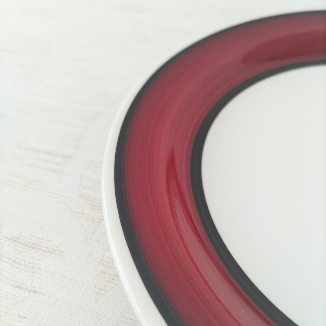 こちらは、ロールストランドのアートディレクターも務めた、カール・ハリー・スタルハネによるデザイン。リム部分を幅広のワインレッドの帯が囲み、その上下から挟み込むように配された漆黒のラインが、全体をぐっと引き締めています。色と線のコントラストだけで視覚的な魅力を生み出しており、グラフィカルな力強さを感じる一枚です。