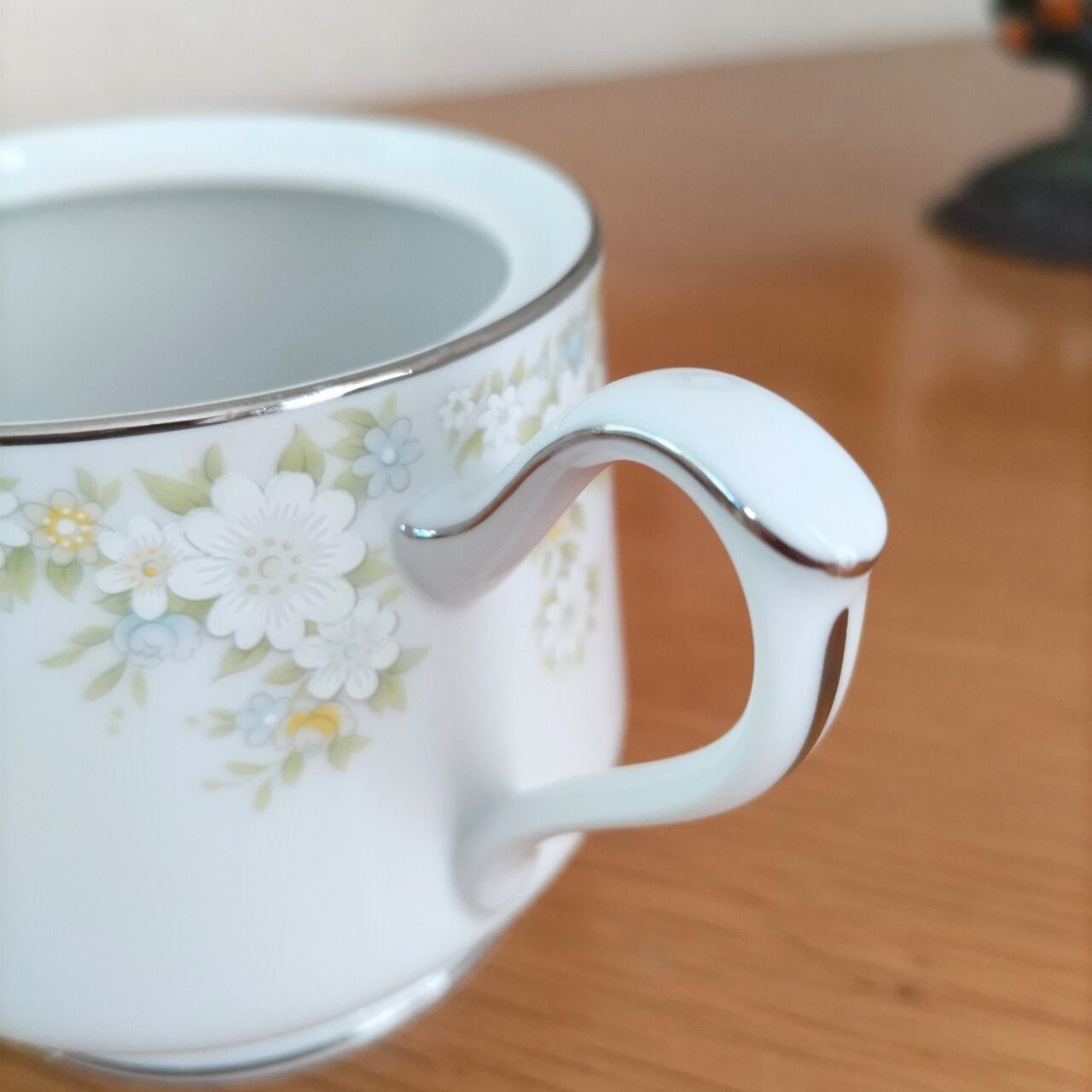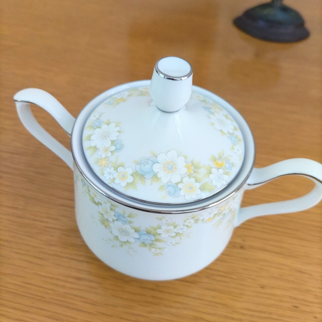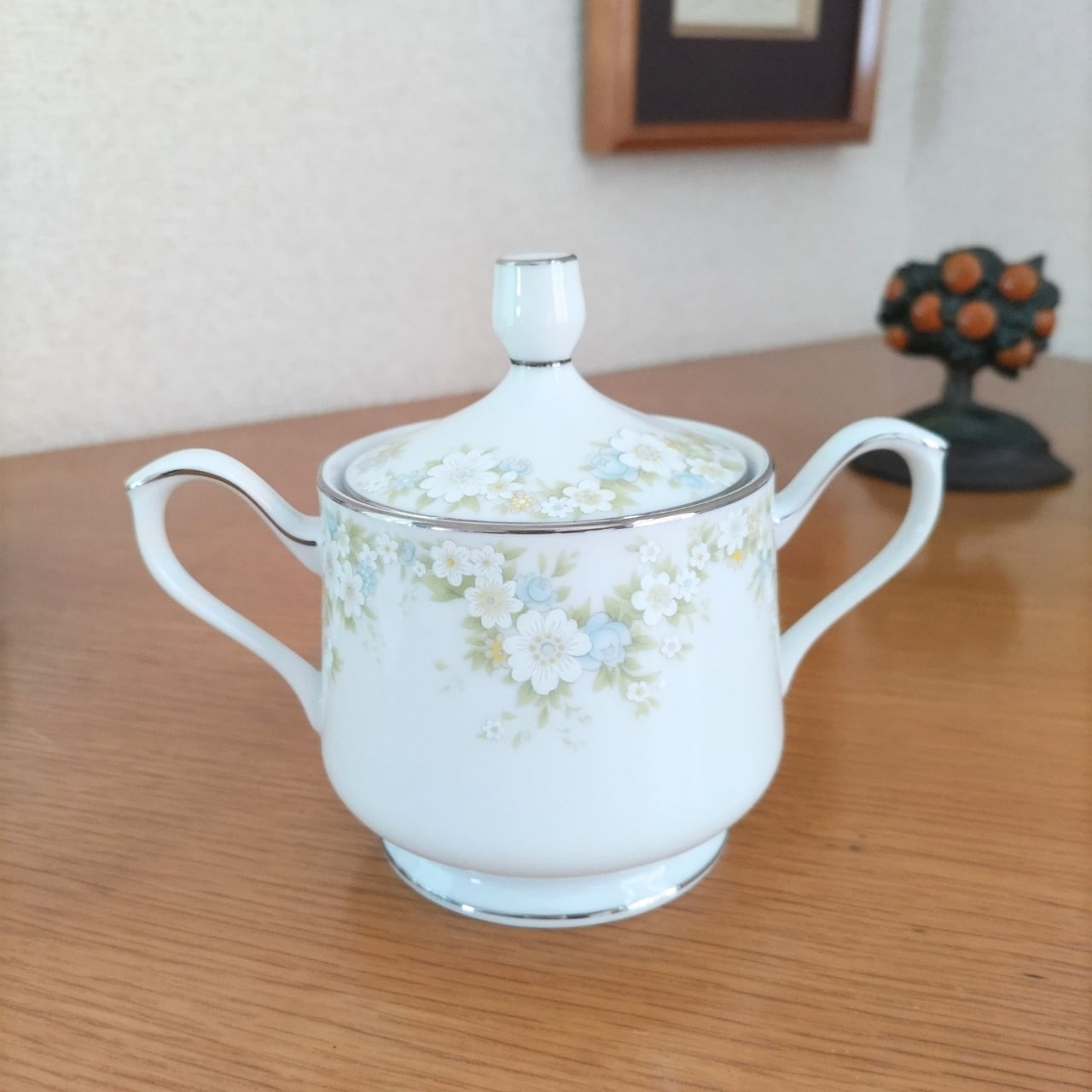 どこか懐かしさを感じる昭和レトロなシュガーポット、日本の陶磁器メーカー「三郷陶器」の製品です。清潔感あふれる純白の素地に、可憐な小花がちりばめられた優しい絵柄が可愛い。