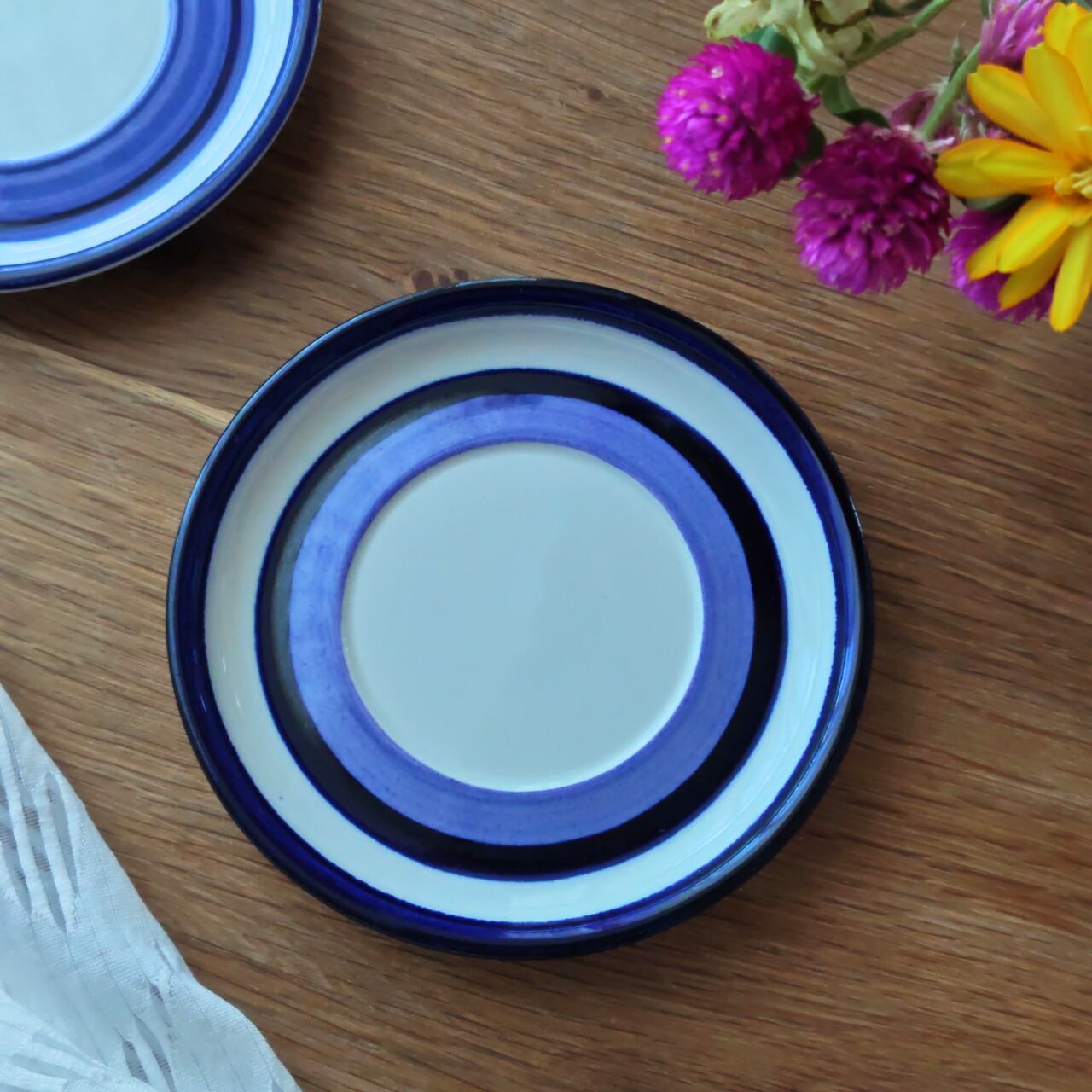 大胆に描かれた青い円弧模様は、まるでねこやなぎが風に揺れているかのような、動きのある表情を生み出しています。職人の手によってひとつひとつ描かれており、釉薬の濃淡や筆のタッチにあたたかみを感じます。