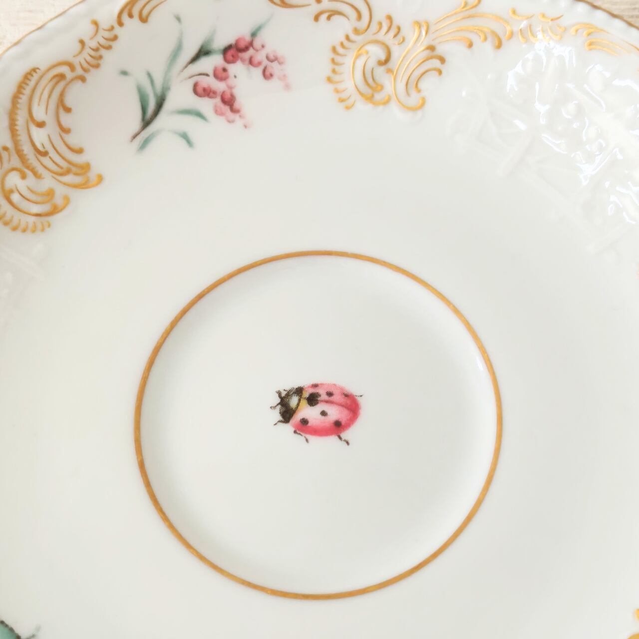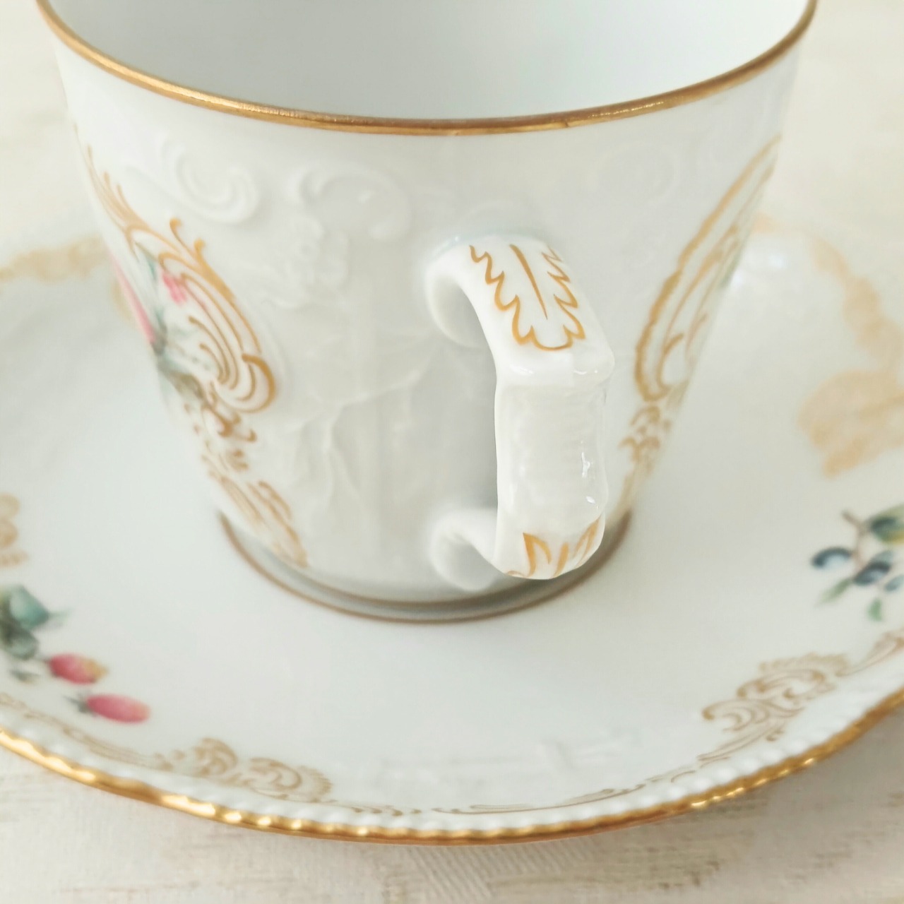 バラや野の花、あるいはシンプルな白磁のデザインが多いシリーズですが、こちらは珍しいフルーツモチーフのアイテム。バラの蔦のエンボスに、ソーサーにはカップに隠れたてんとう虫のアクセント。クラシックな美しさと、心くすぐる遊び心があります。