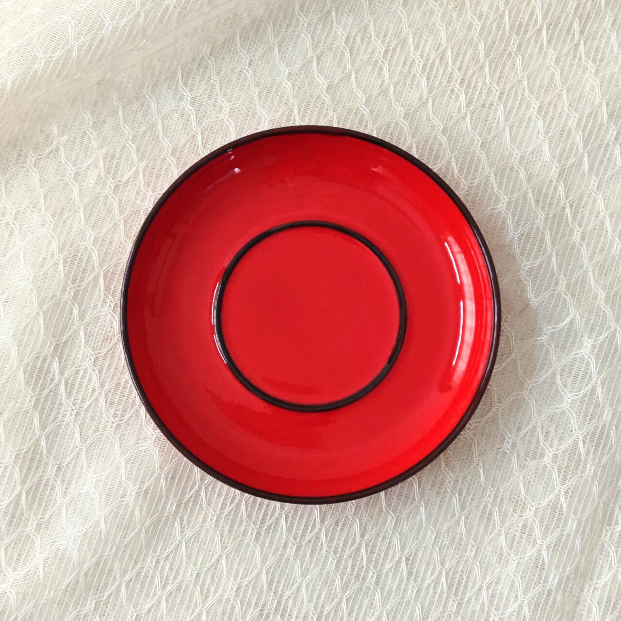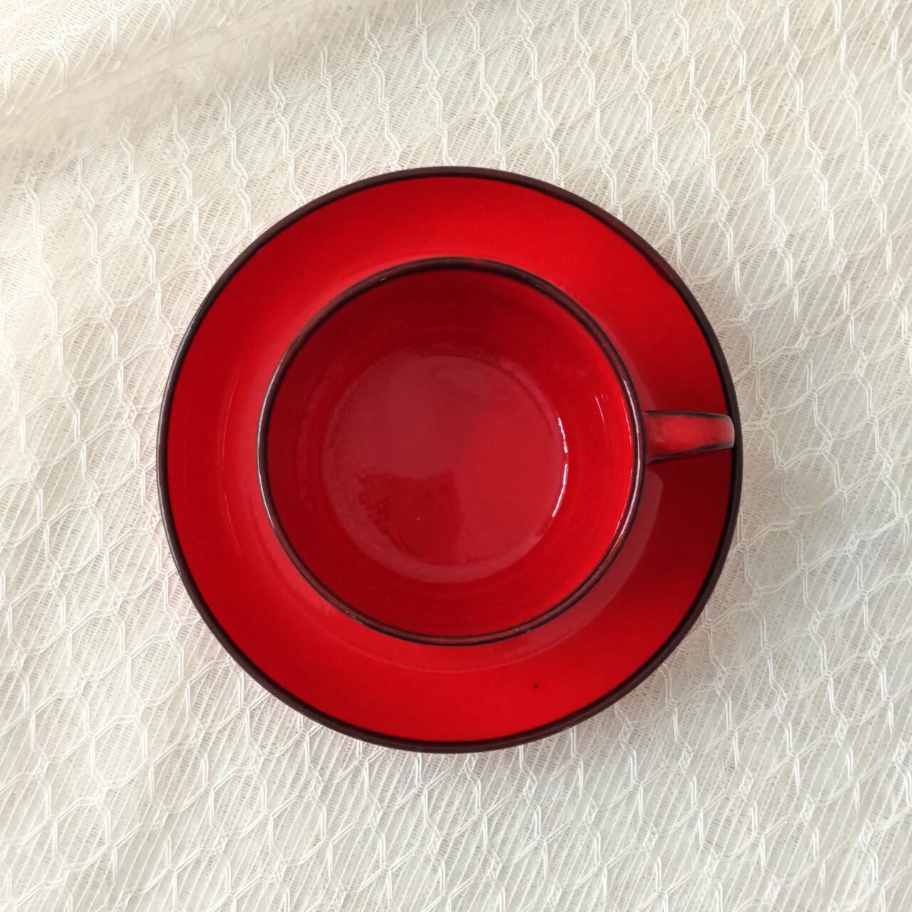 サンタクロースの洋服のような深い赤に黒の縁取りデザイン。コーヒーや紅茶はもちろん、トーストにポタージュを添える朝食にもぴったり。クリスマスの時期には白い粉糖のシュトーレンがよく映えます。