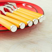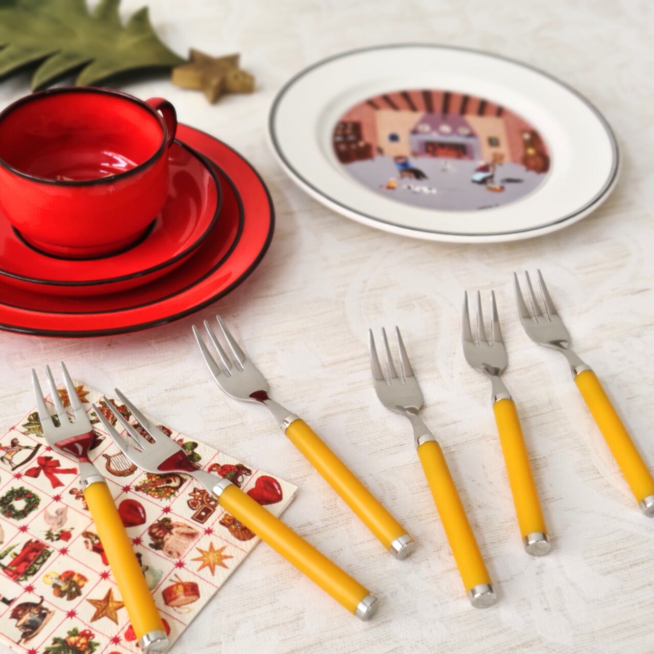 レトロなシトラスイエローのハンドルと、ステンレスシルバーのコントラストが美しく、日常使いのテーブルウエアによく映えます。ハンドルは樹脂製で手に馴染みやすく、デザートやケーキにちょうど良いサイズ感。