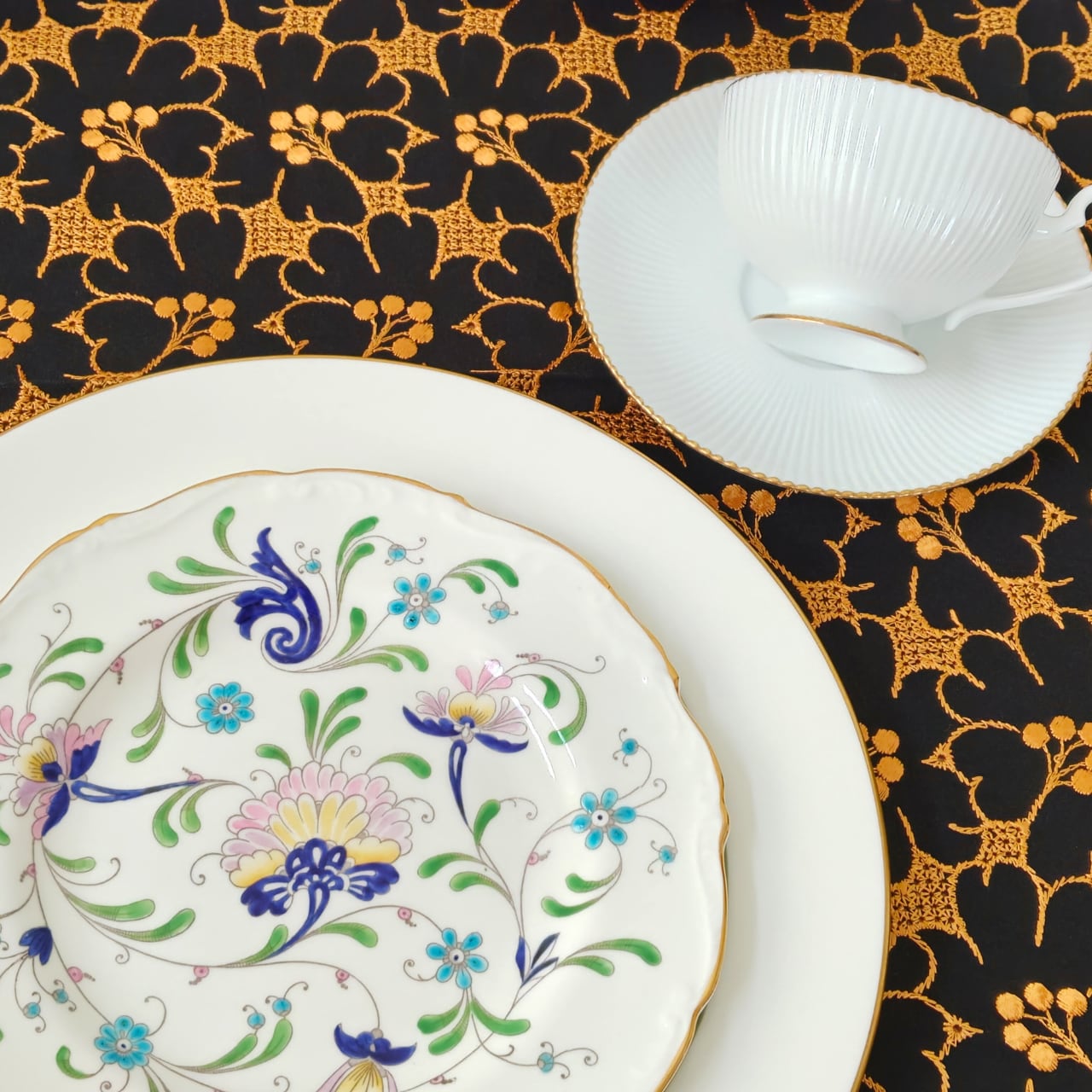 上質なボーンチャイナをキャンバスに、ロイヤルブルー、ピンク、ターコイズ、イエローといった鮮やかなエナメル彩色でエキゾチックな草木が大胆に描かれています。