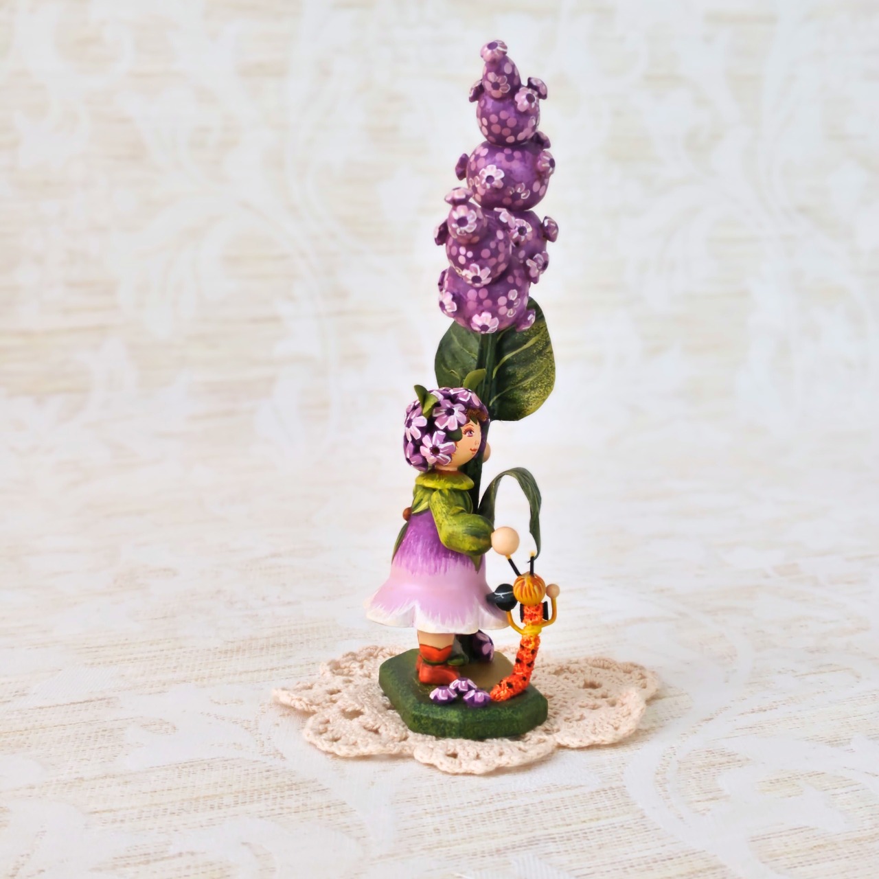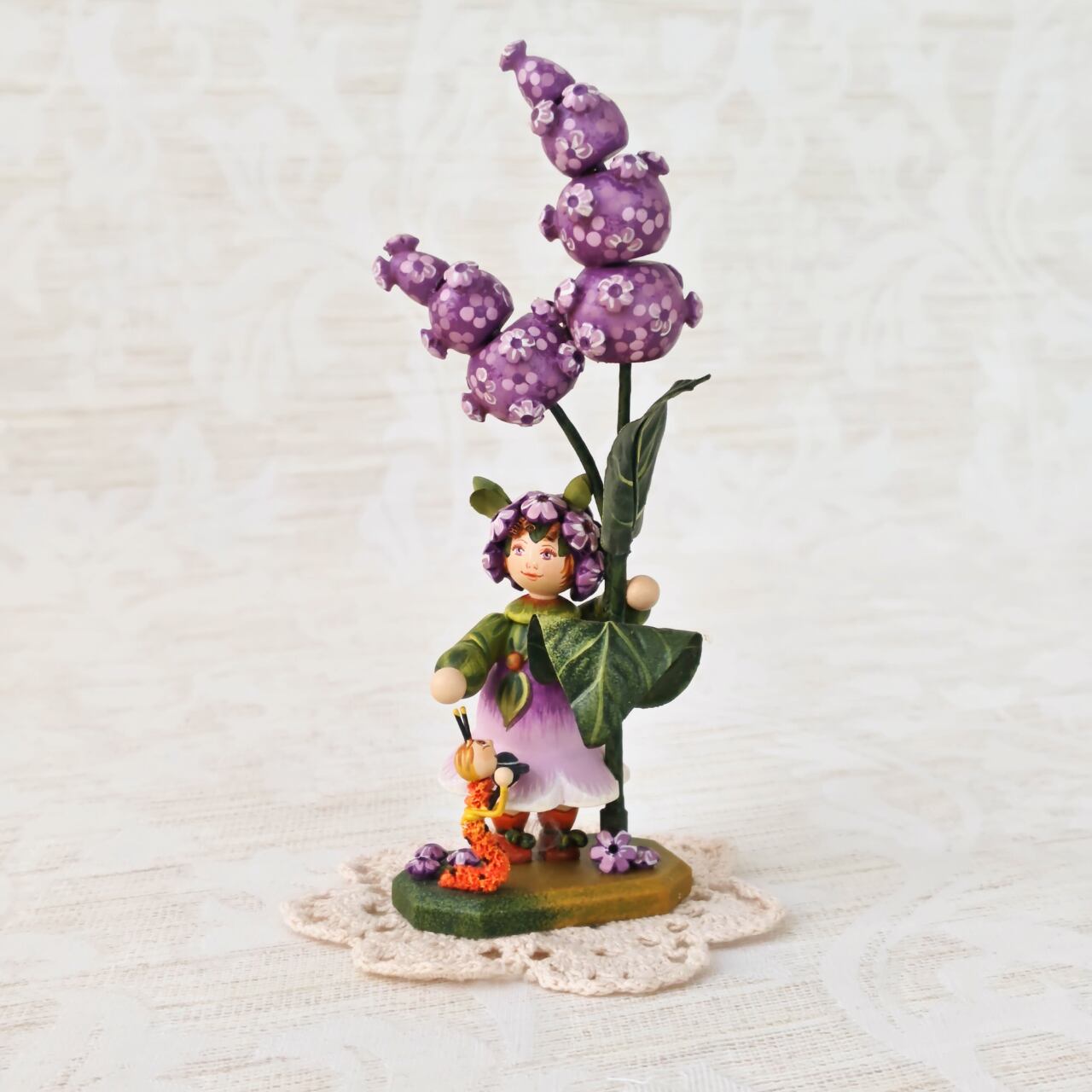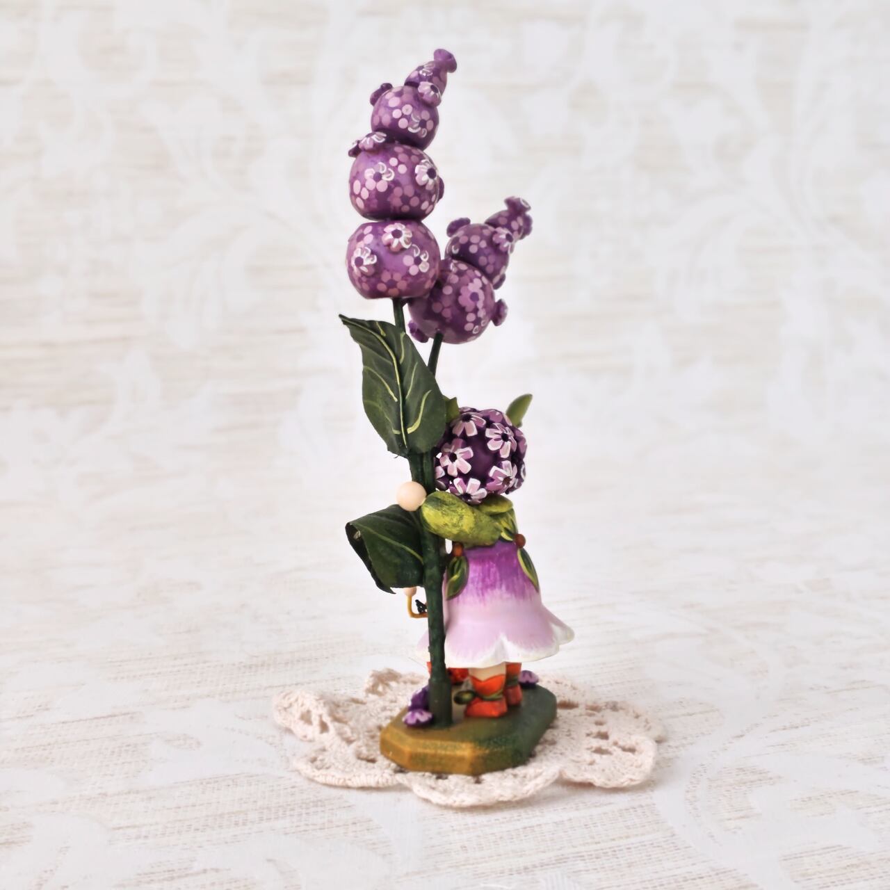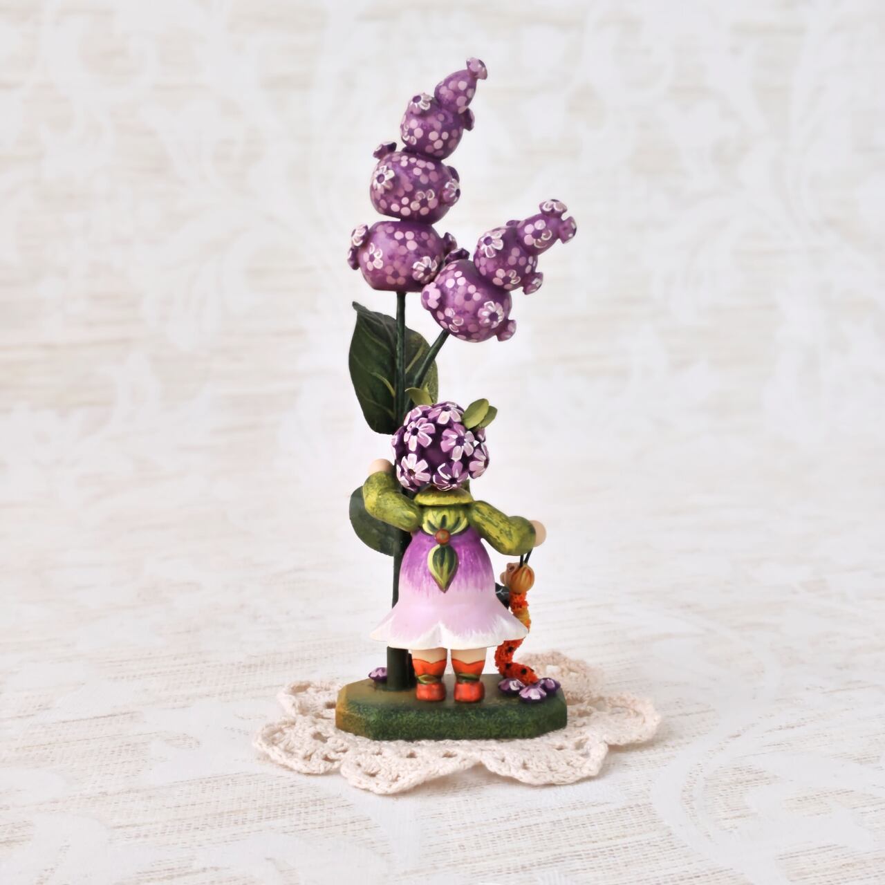 紫の花に寄り添う小さな女の子の姿は、どこか物語のワンシーンのような佇まい。素朴な木の質感と、職人の手仕事によるやさしい彩色が、眺めると心を和ませてくれます。