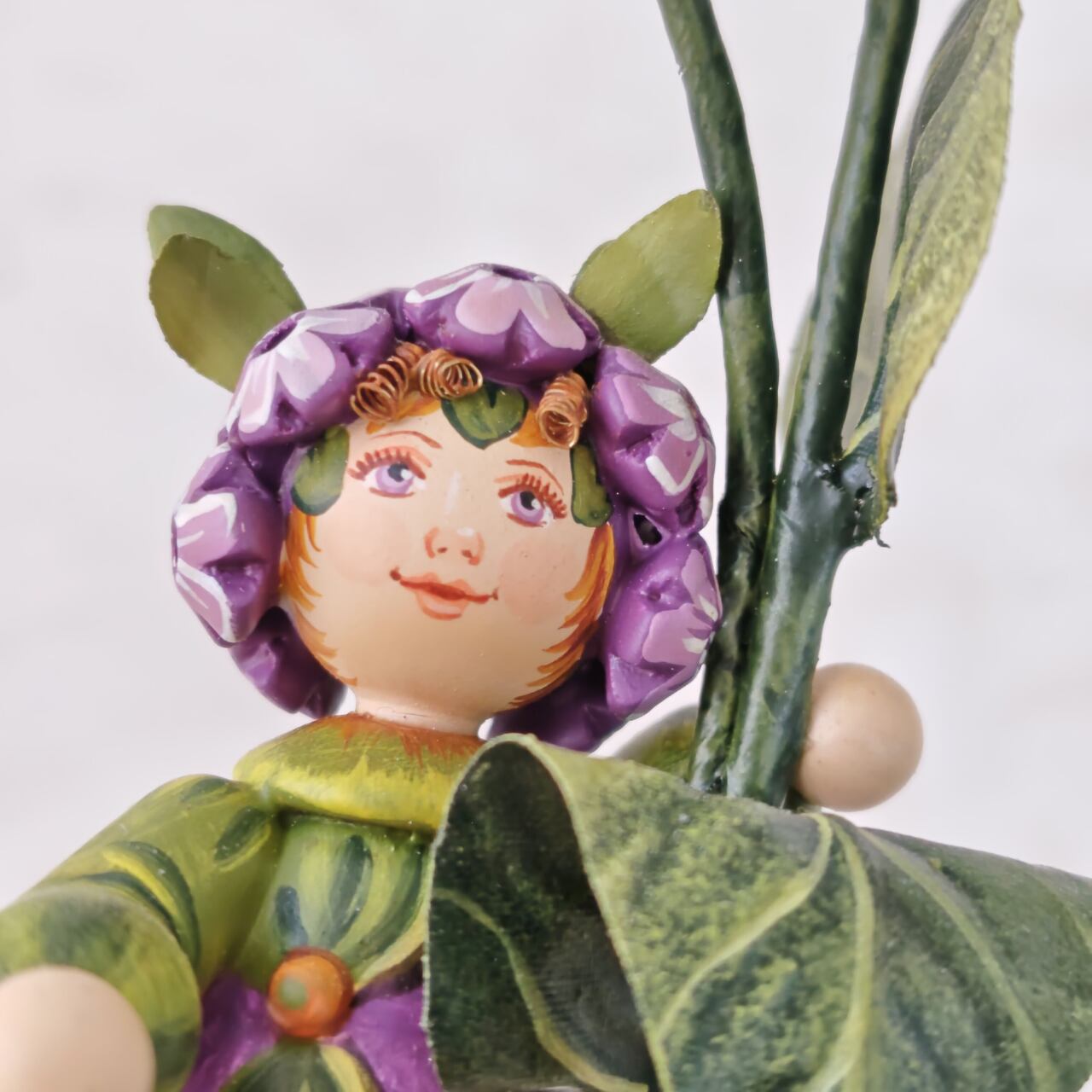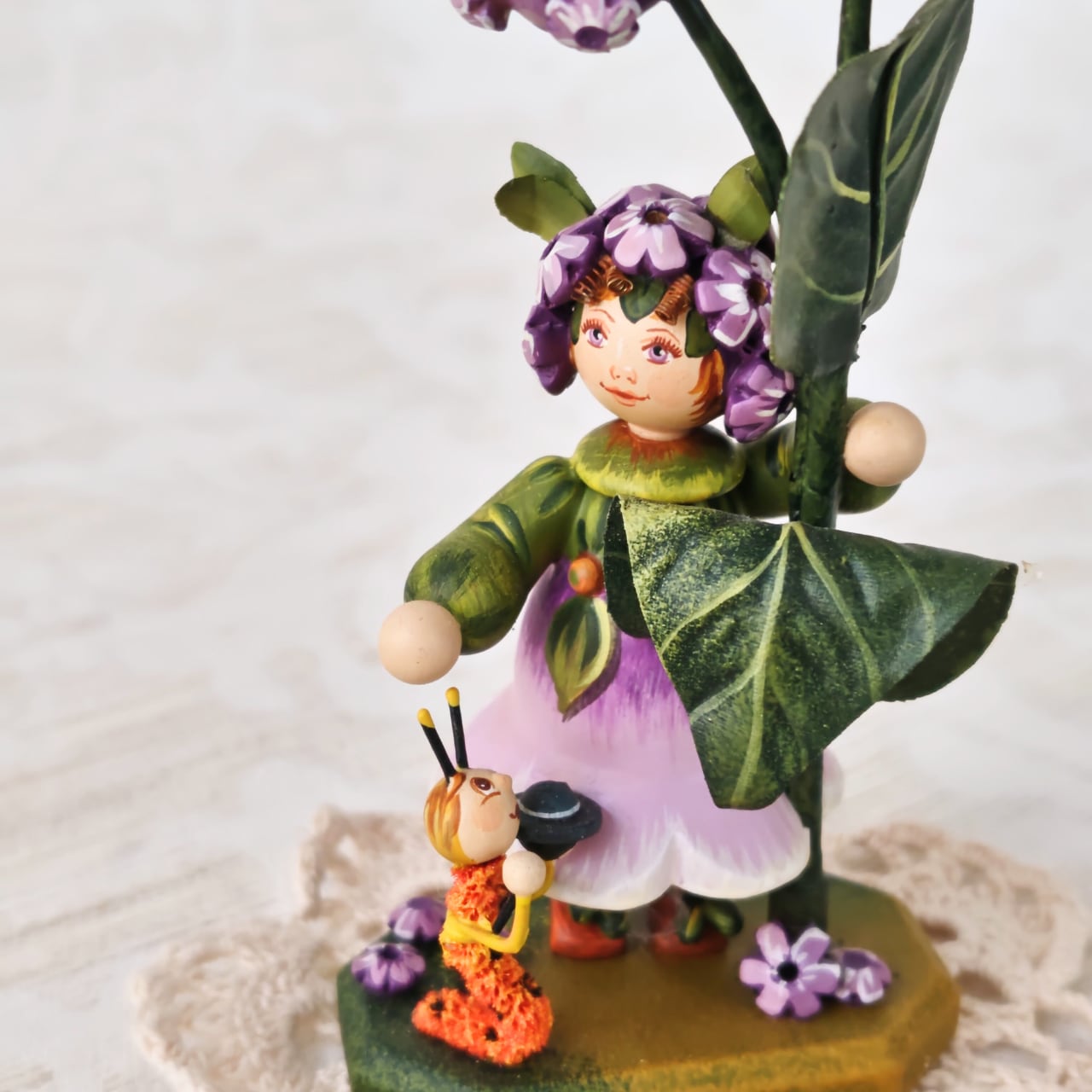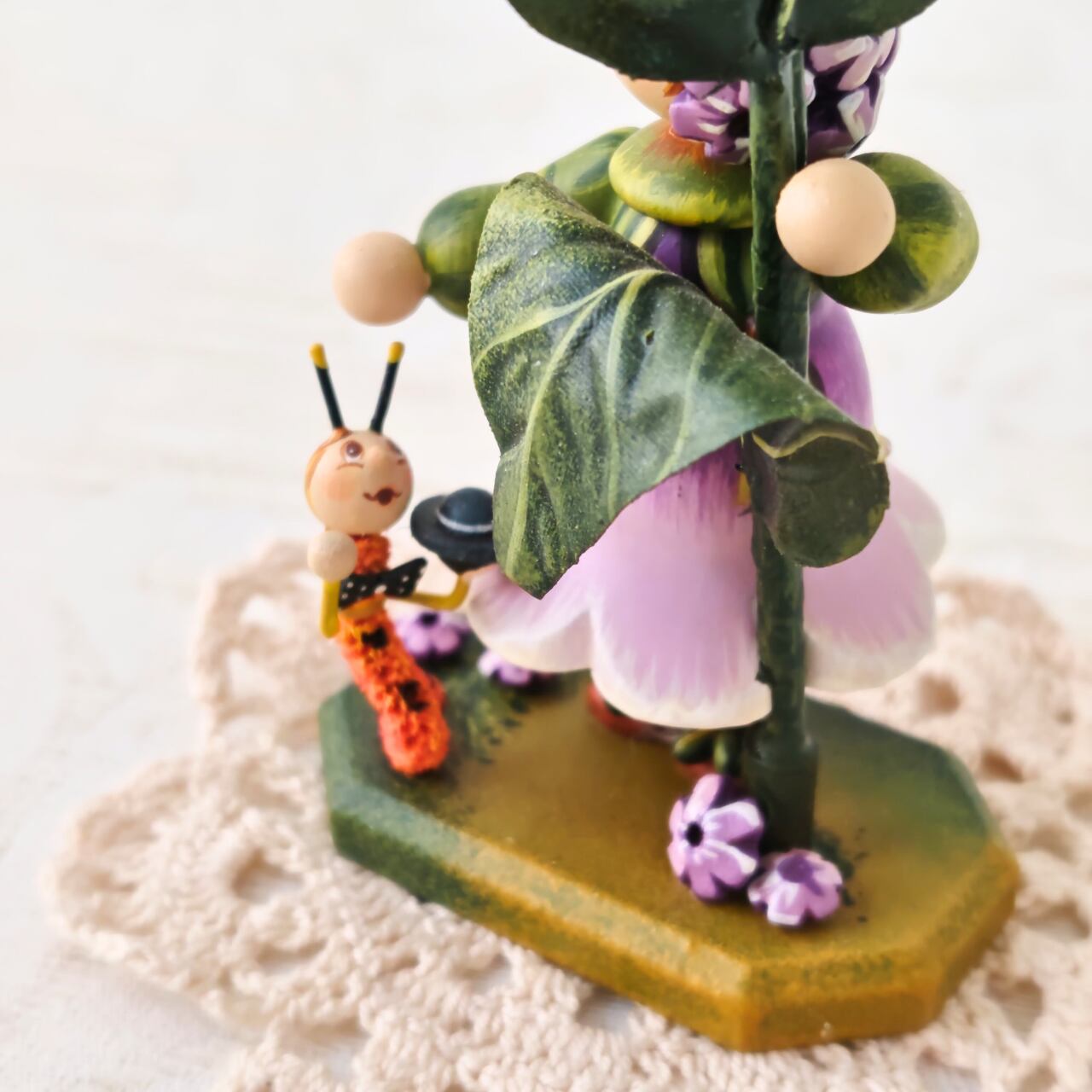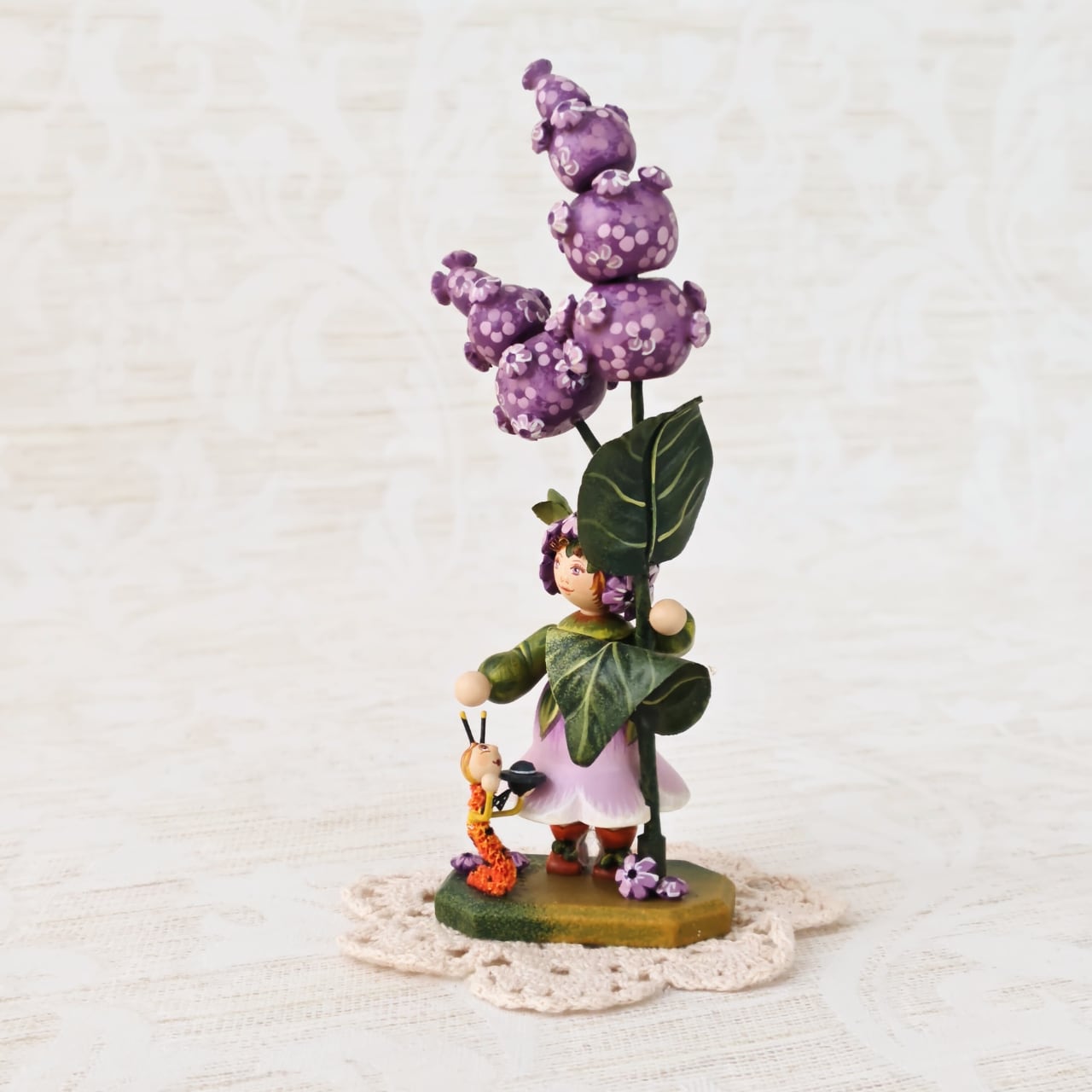 紫の花に寄り添う小さな女の子の姿は、どこか物語のワンシーンのような佇まい。素朴な木の質感と、職人の手仕事によるやさしい彩色が、眺めると心を和ませてくれます。