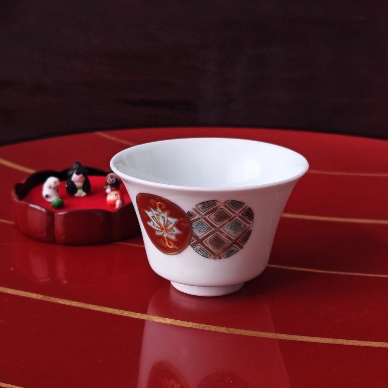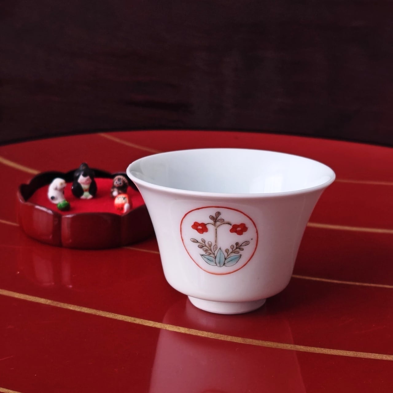 金彩の縁起の良い赤絵丸紋と、反対側には不思議なバランスのお花が咲いています。口縁がわずかに外側に広がった「端反(はぞり)」の形状。この形状は口当たりが良くなるため、日本酒の味や香りを滑らかに伝え、呑みやすいのが特徴です。