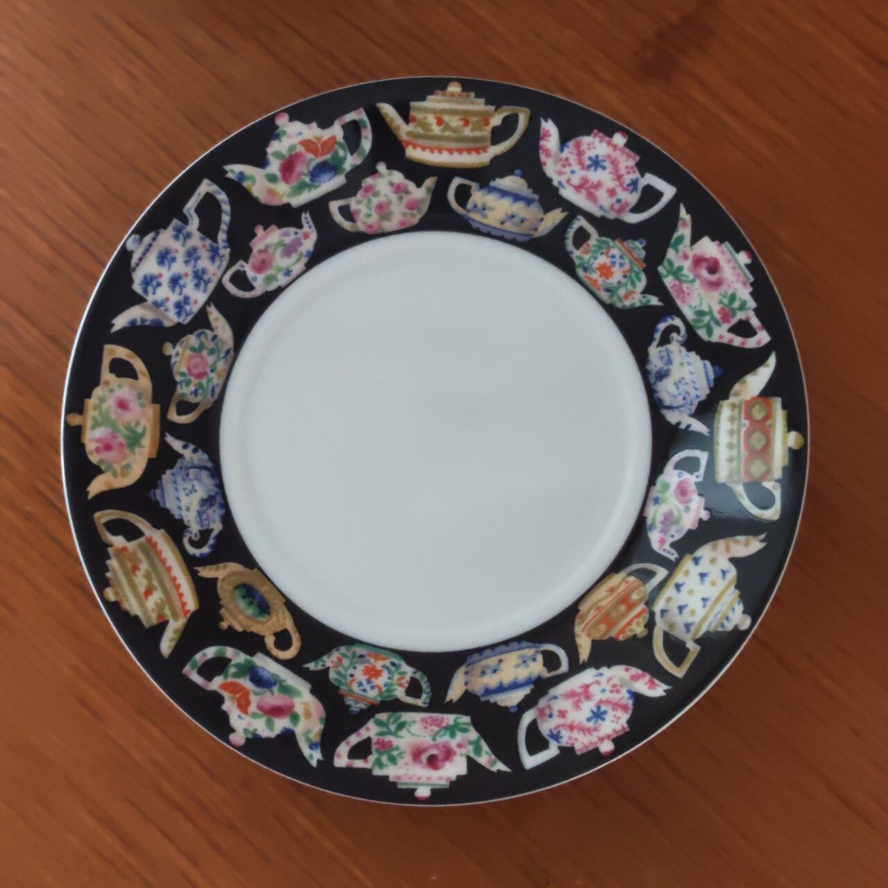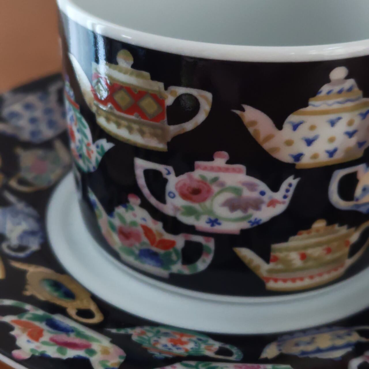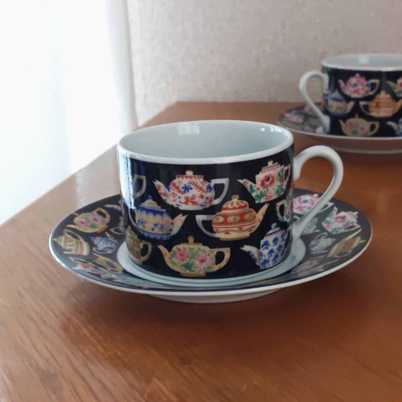黒地に浮かび上がる色とりどりのティーポットやカップの絵柄は、ティーポットの図鑑のような楽しさがあり、ついつい眺めてしまいます。