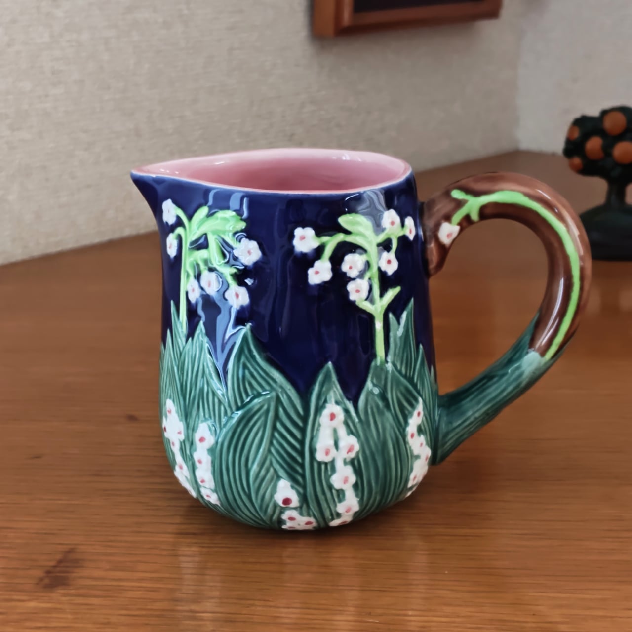 コバルトブルー×ピンク×スズランが可愛いクリーマー。ハンドルにもスズランが描かれる遊び心も惹かれます。