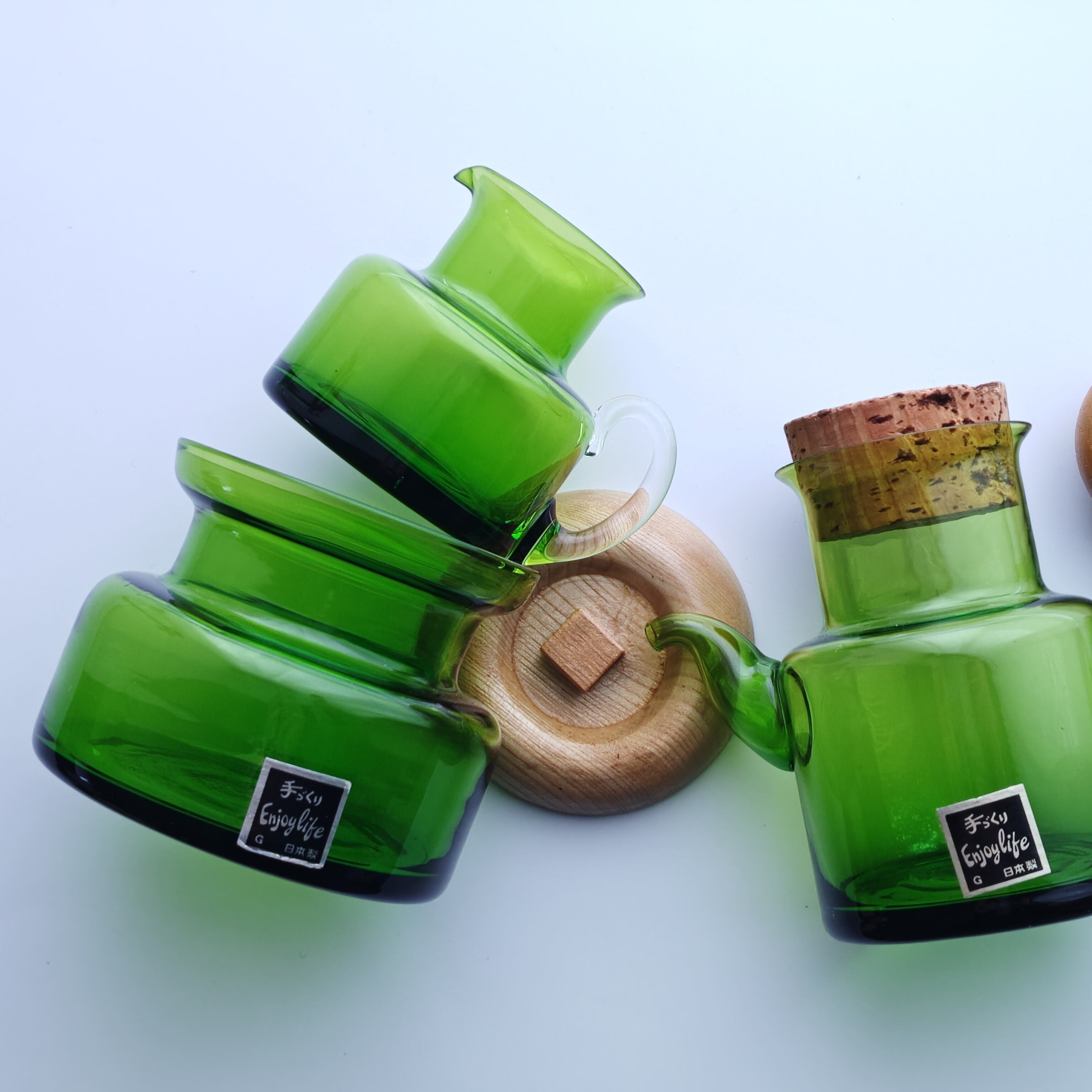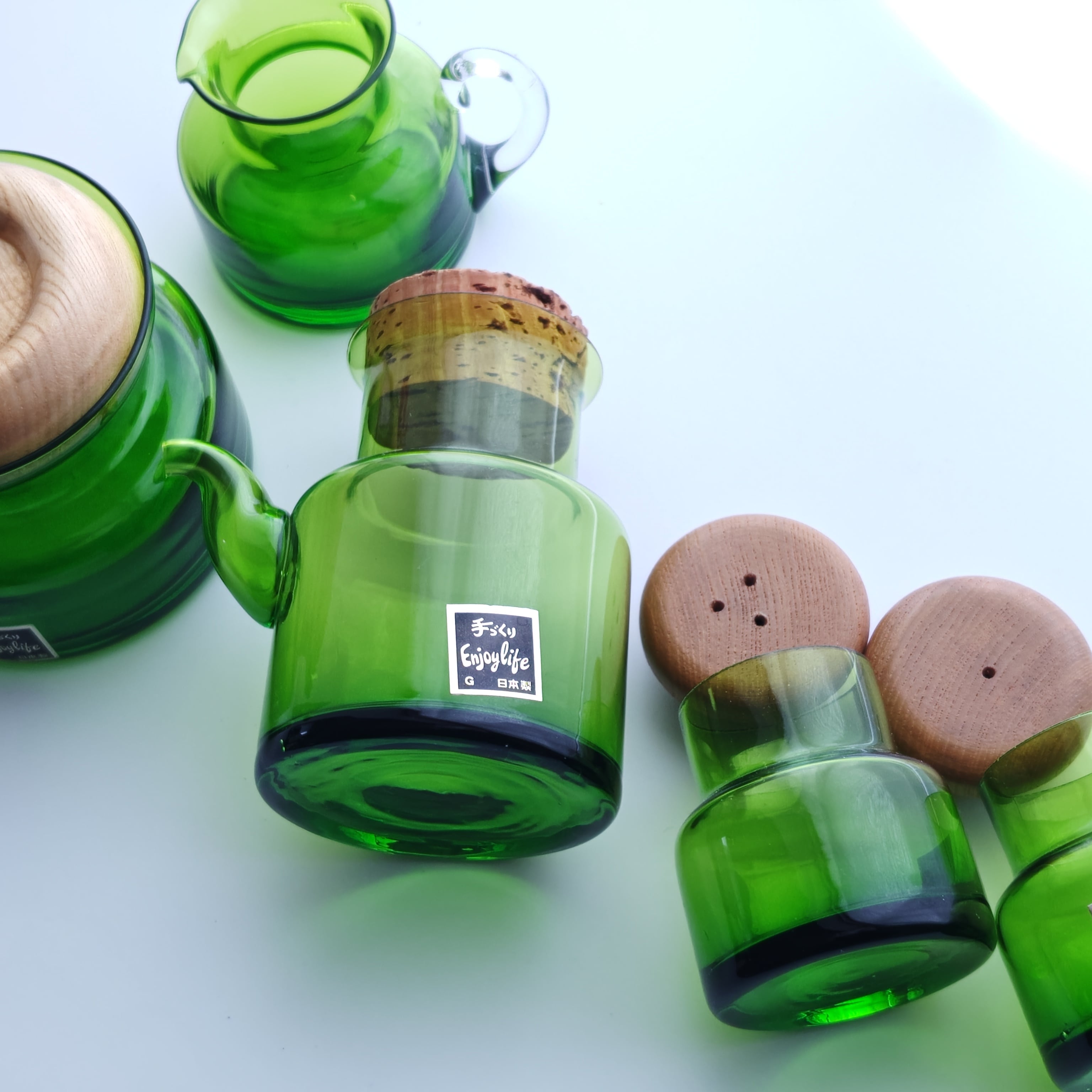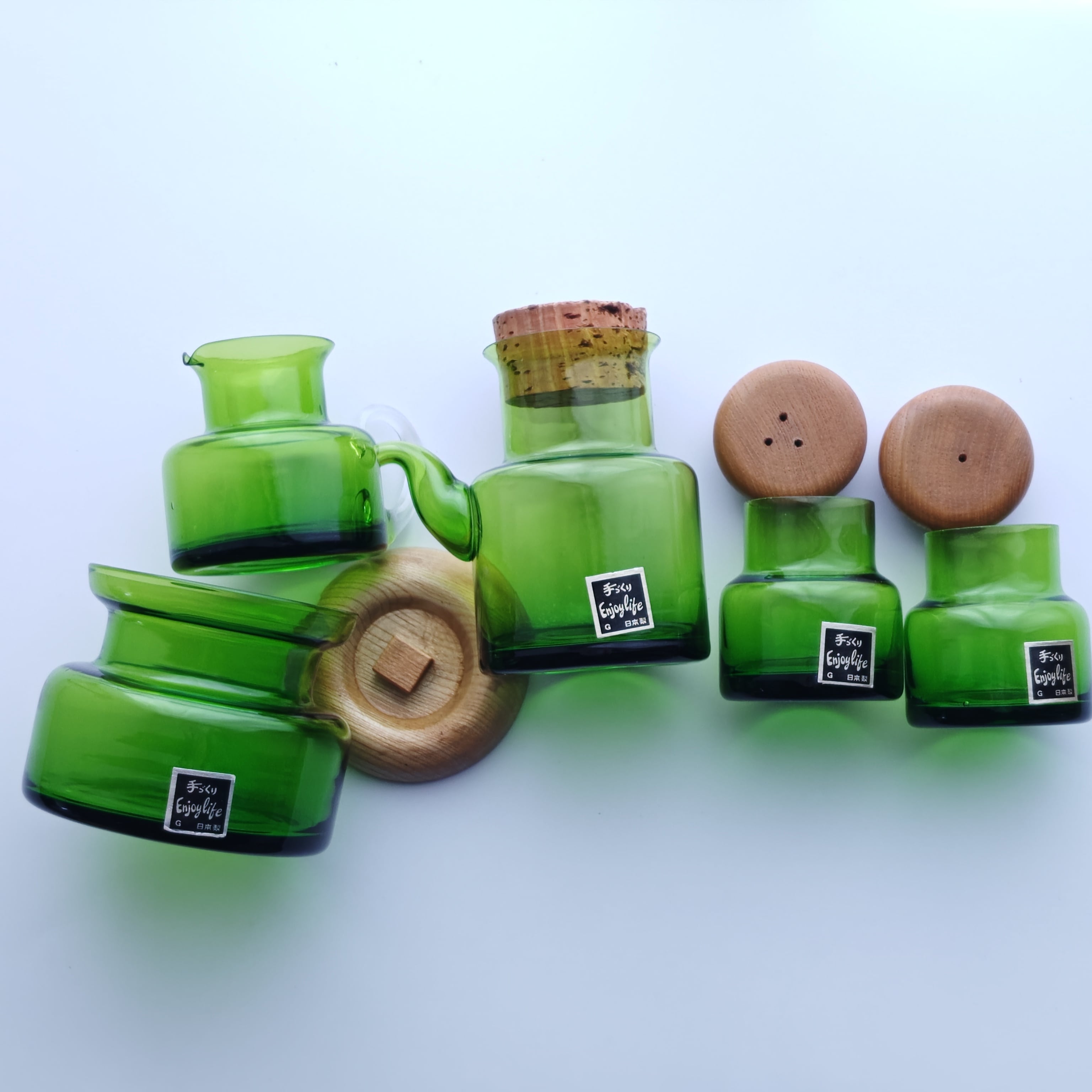 日本製 グリーンの薄はりガラス キッチンウェア 調味料入れ 5点セット 昭和レトロ 花瓶 インテリア オブジェ