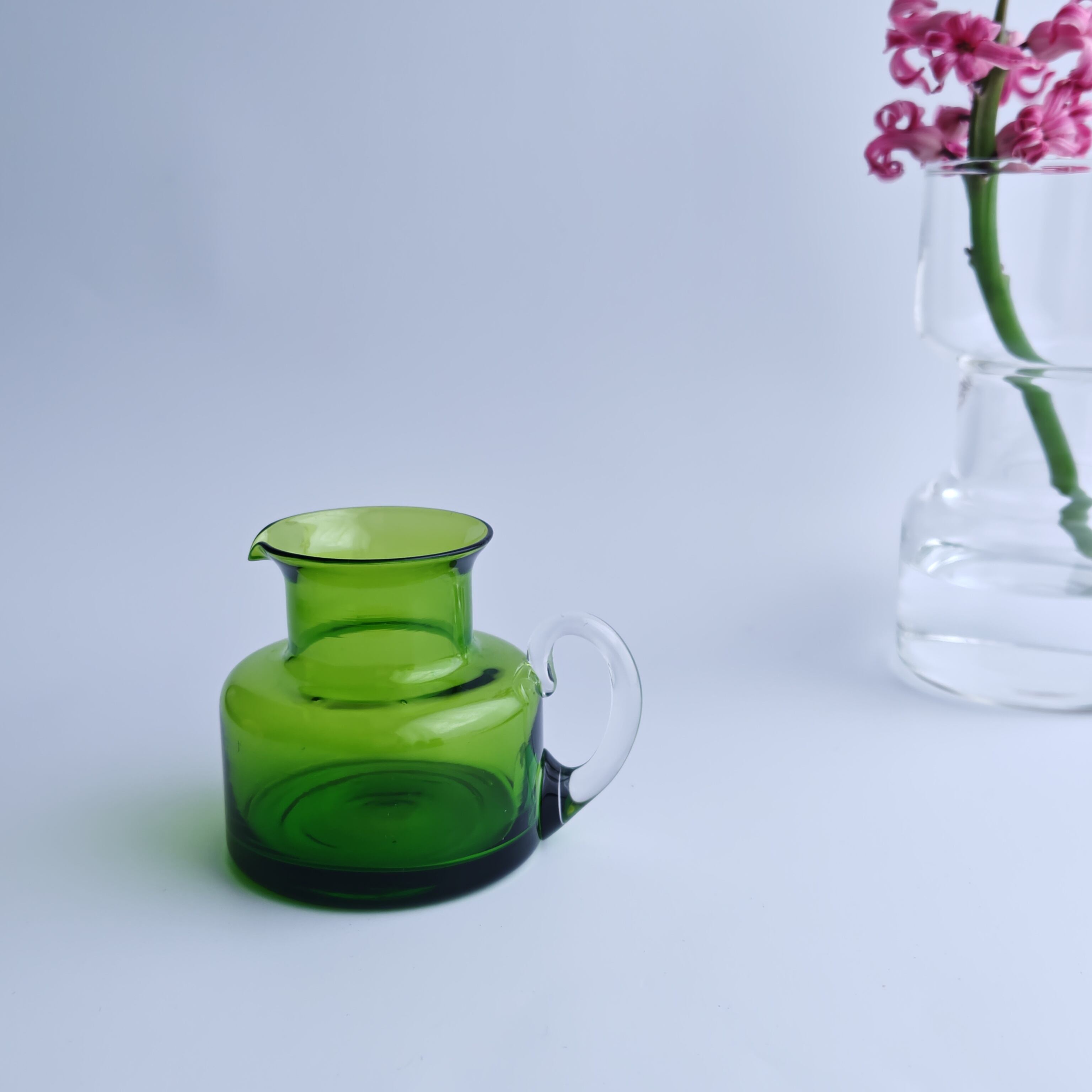 小さな花瓶として、季節の草花を。グリーンのガラスはお花の引き立て役。