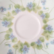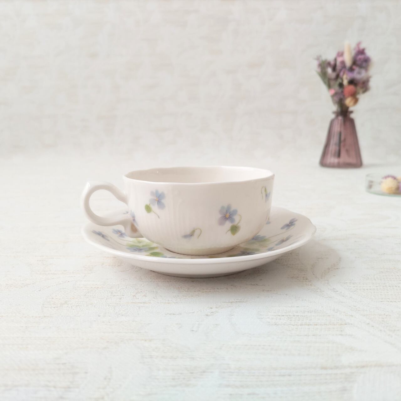 可憐なスミレの絵柄がちりばめられた、桃山陶器のヴィンテージティーカップ&ソーサーです。よく見ると、絵柄に重ねて施された水面のような放射線状のレリーフがあり、華やかさがを演出しています。
