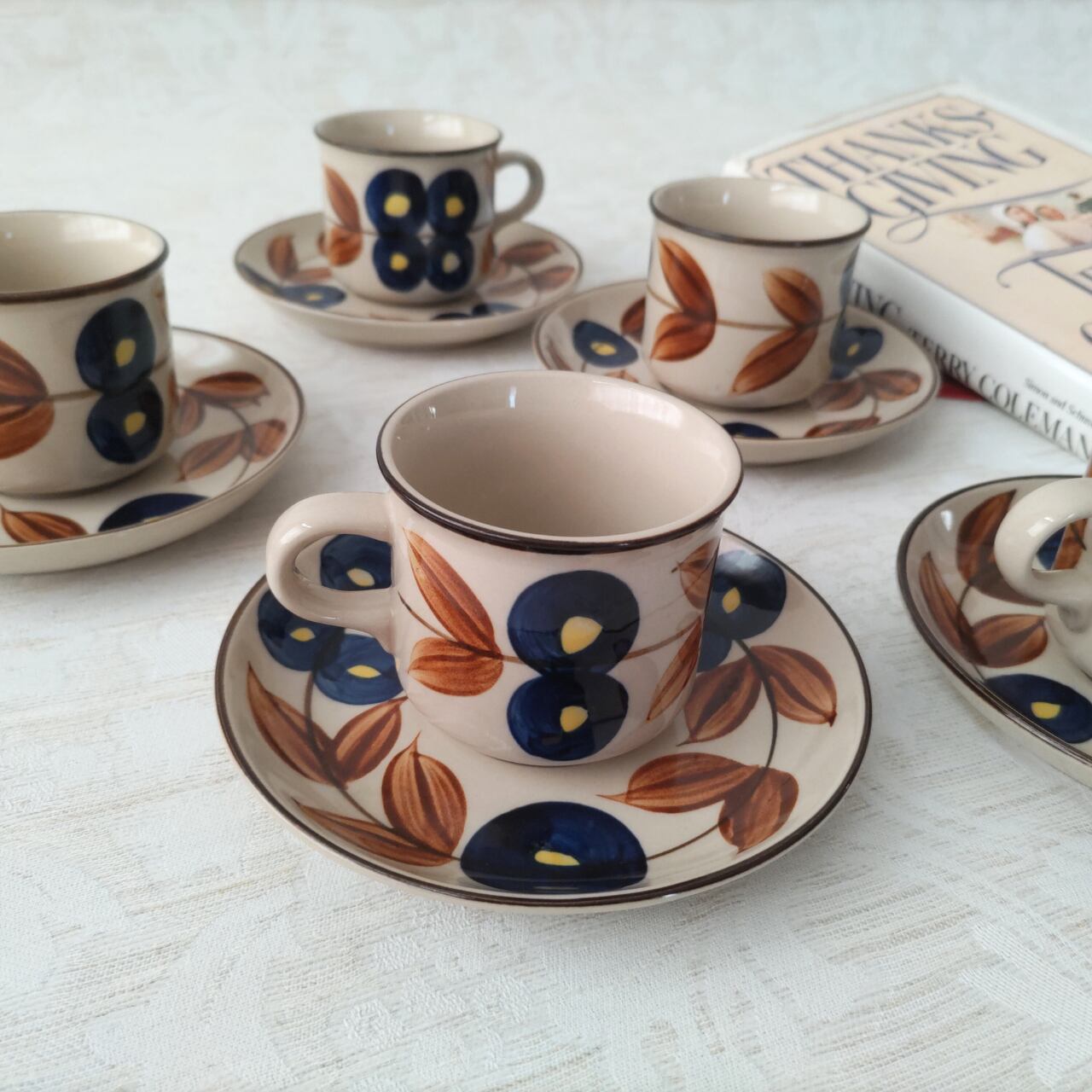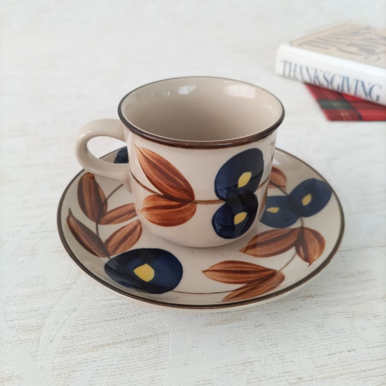 桃山陶器のヴィンテージコーヒーカップ&ソーサーです。温かみのあるストーンウェアの色味に、存在感のある手描きの花柄がアクセントになっています。カップの底裏には、ひとつひとつ丁寧に手押しされたバックスタンプがあり、個性的な表情を加えています。