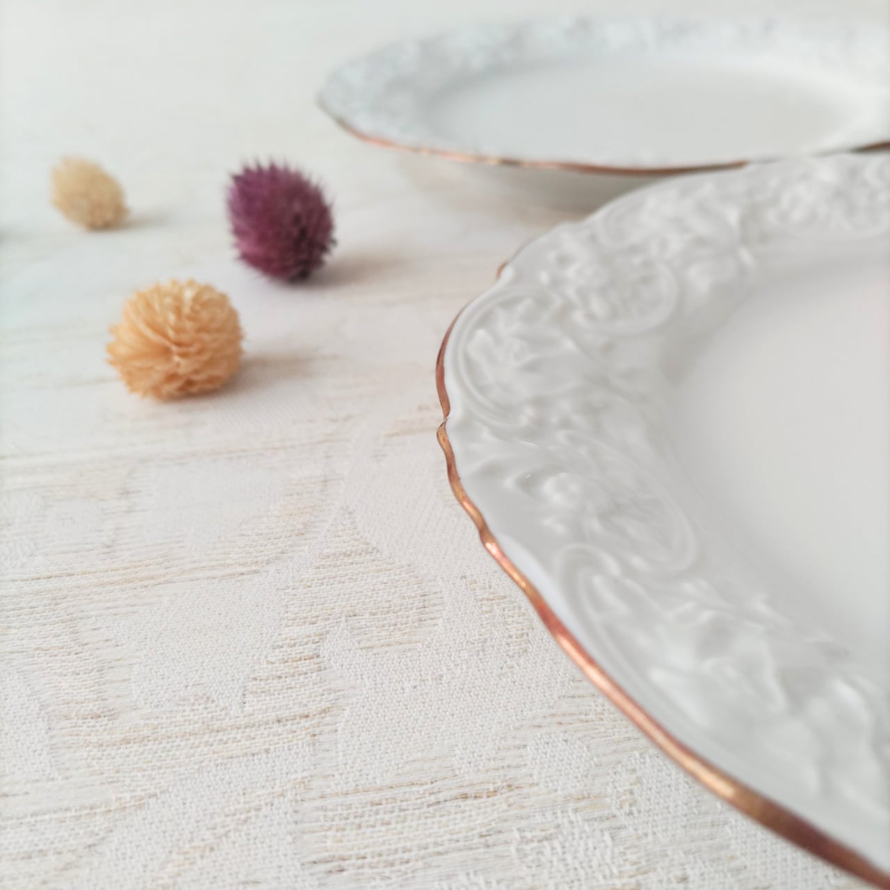 クラシカルな植物模様が光の加減で表情を変える様子が、まるで美術品のようなお皿。ピンクゴールドのような色合いの金彩で縁取られ、華やかさと上品さを演出します。アクセサリートレイなどインテリアとしてもおすすめします。